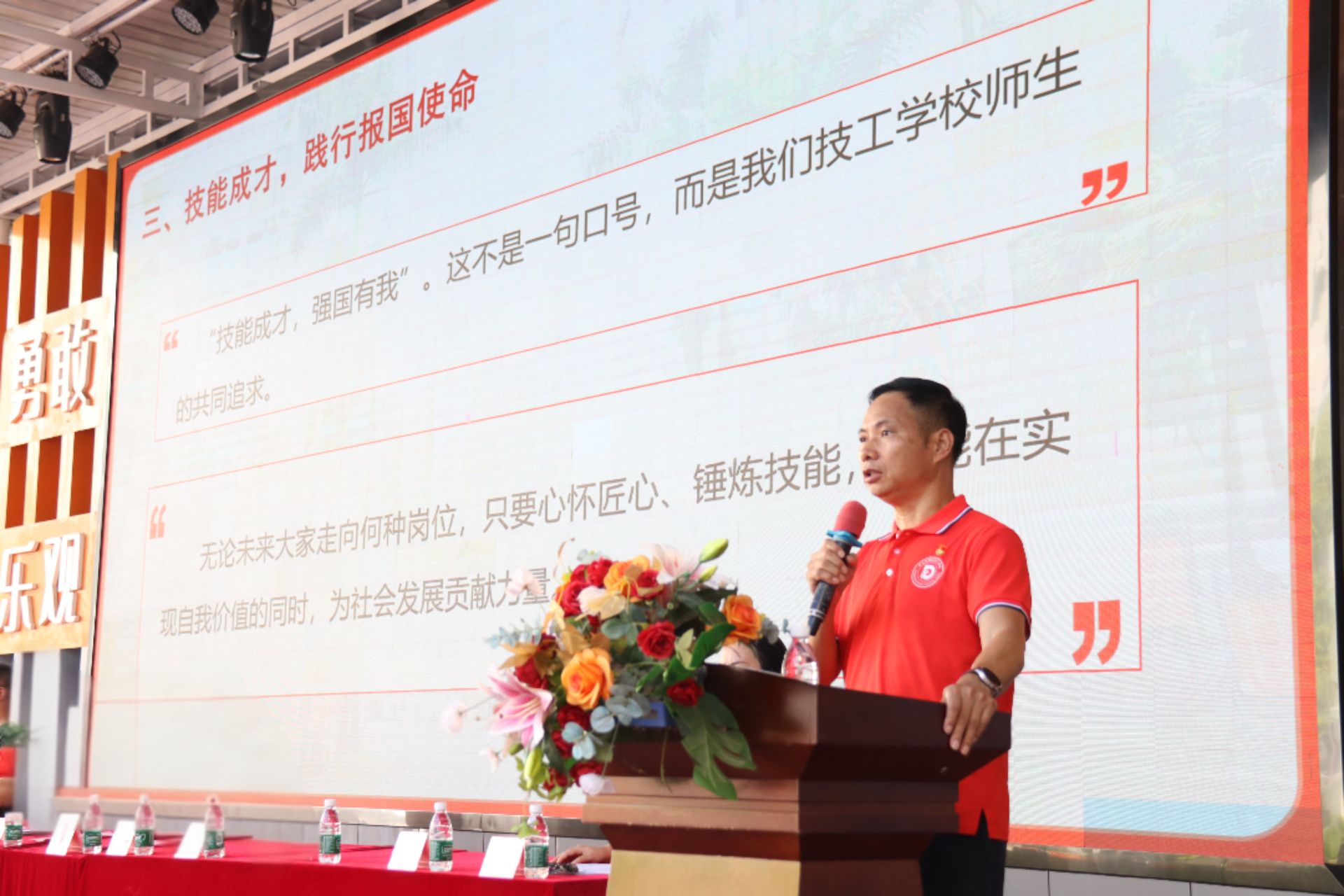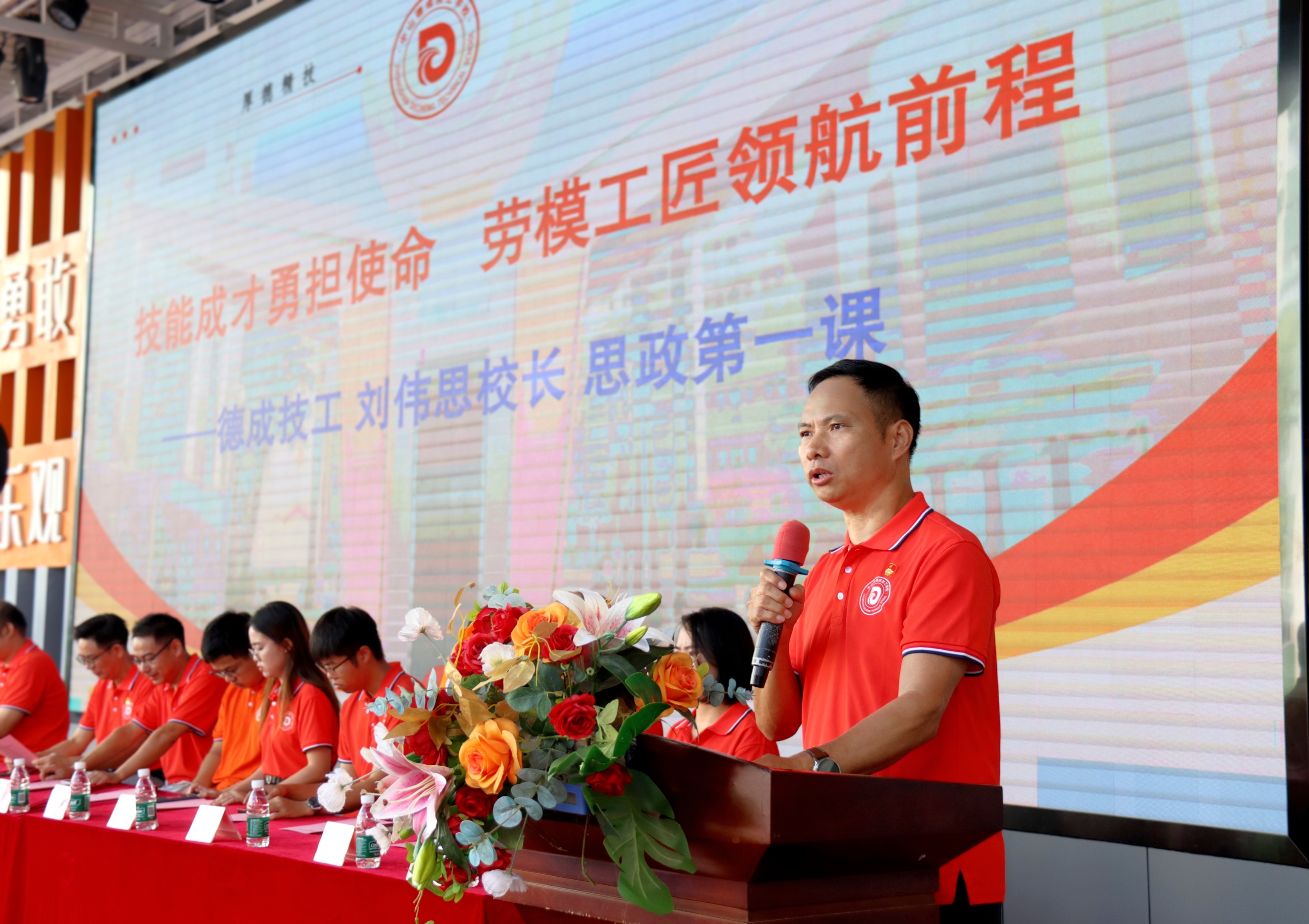 9月12日上午,在中山市德成技工学校2025年秋季学期开学典礼暨思政第一课上,刘伟思校长以“技能成才勇担使命,劳模工匠领航前程”为主题,为全校师生带来一堂深刻而生动的思政第一课。这场融合历史厚度与时代高度的思想盛宴,以“铭记历史、涵养匠心、技能报国、开创未来”为主线,为师生们注入奋进新学期的精神动能。