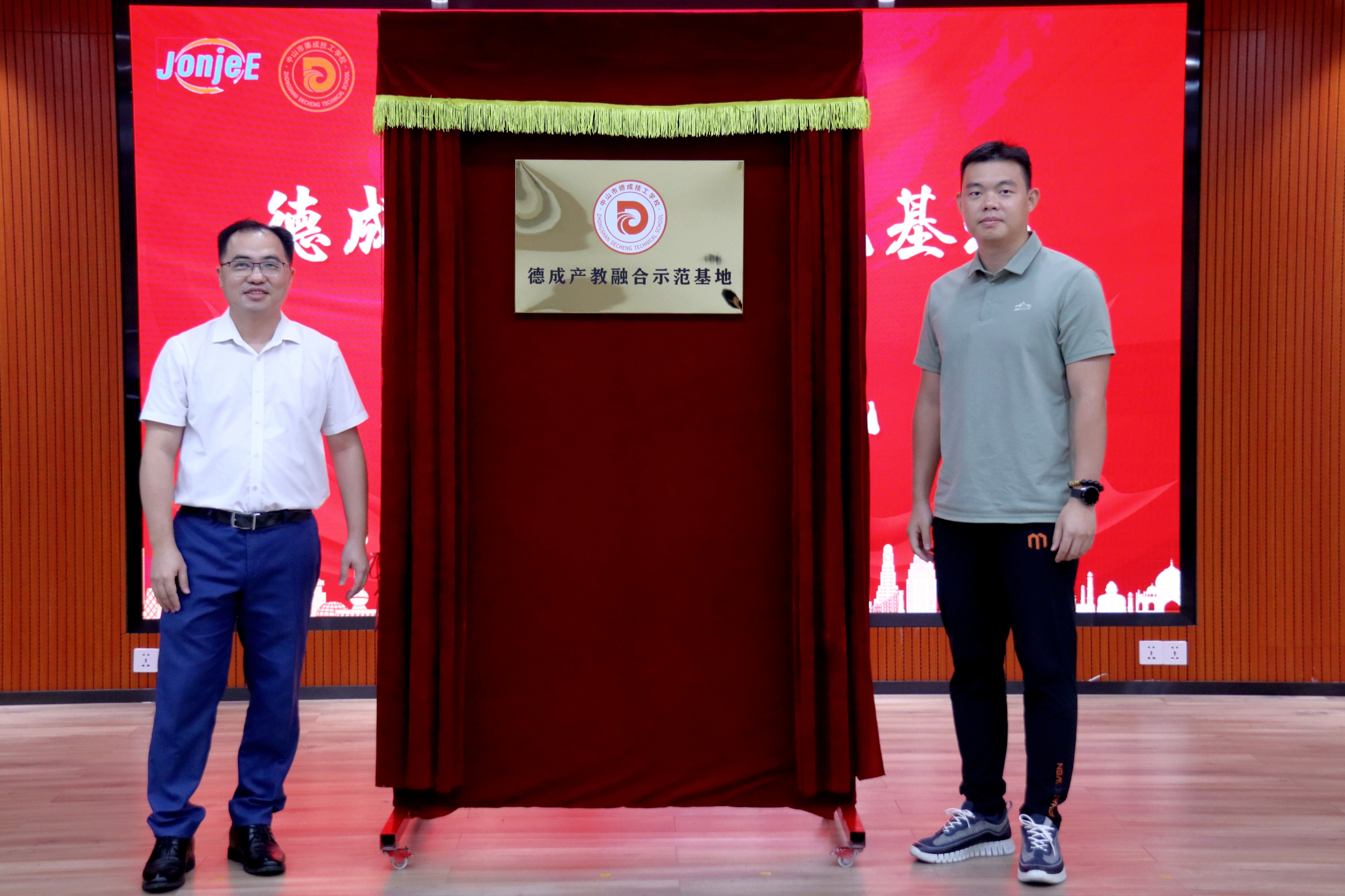 中炬高新副董事长余健华、德成技工学校董事长魏业奇先生,共同为“德成产教融合示范基地”揭牌。